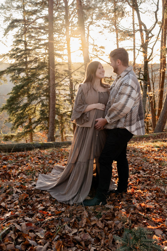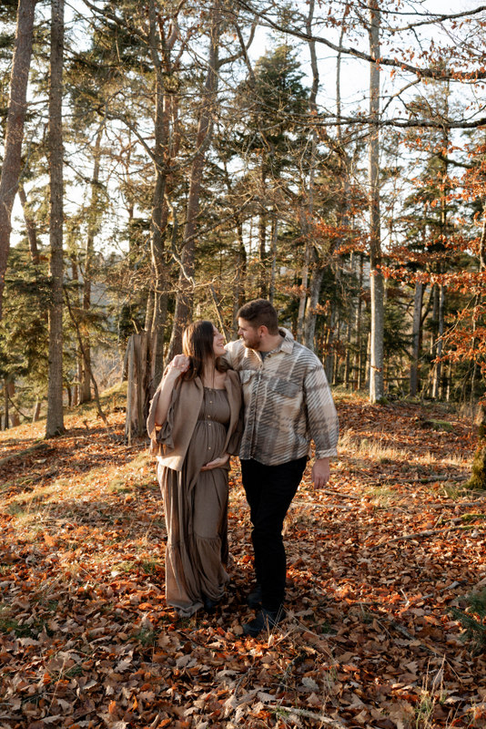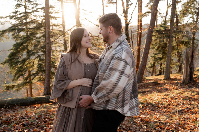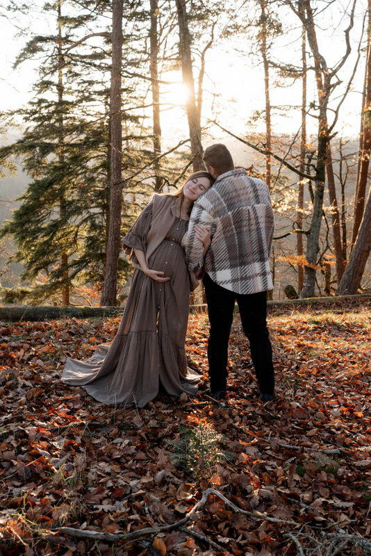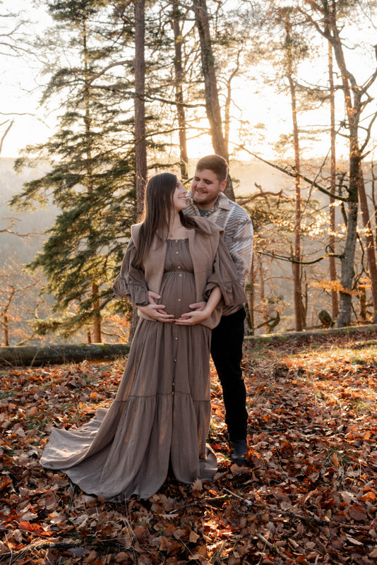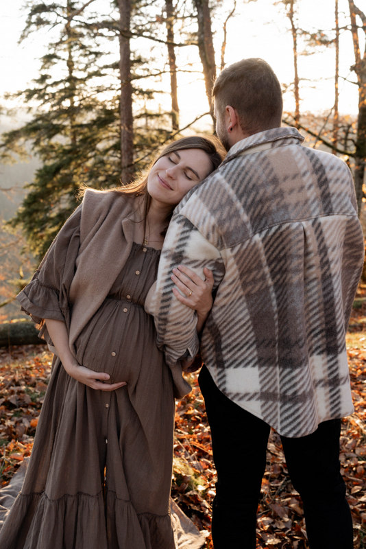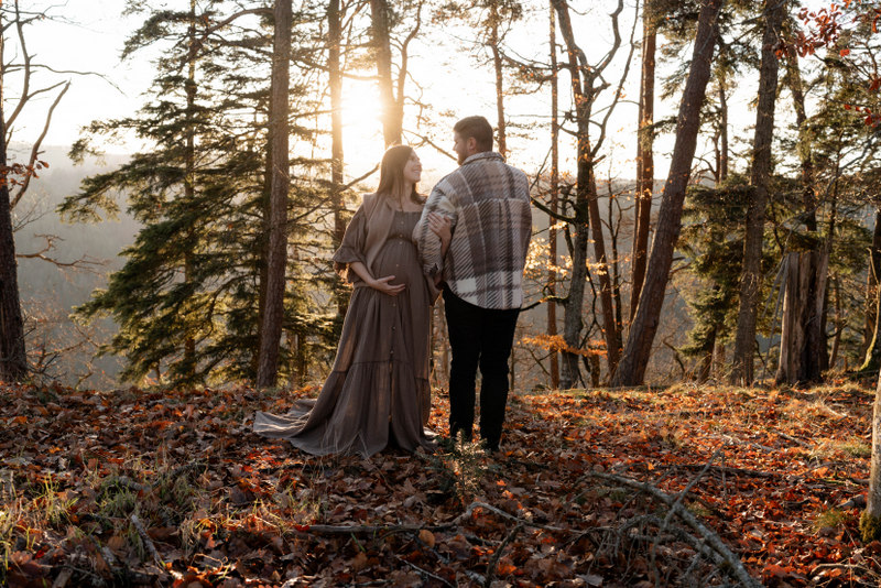 Trotz der kühleren Jahreszeit wurden wir von einem warmen, goldenen Sonnenuntergangslicht begleitet, das die wunderschönen Herbstfarben im Wald zum Leuchten brachte. Genau diese besondere Lichtstimmung und die Ruhe des Spätherbstes machen Maternity Fotos zu dieser Jahreszeit so unglaublich stimmungsvoll. Unsere Region – vom Schwarzwald bis hin zur Nähe zur Schweiz – bietet dafür die perfekte Kulisse: sanfte Waldwege, warme Farbtöne und eine Natur, die Geschichten erzählt.