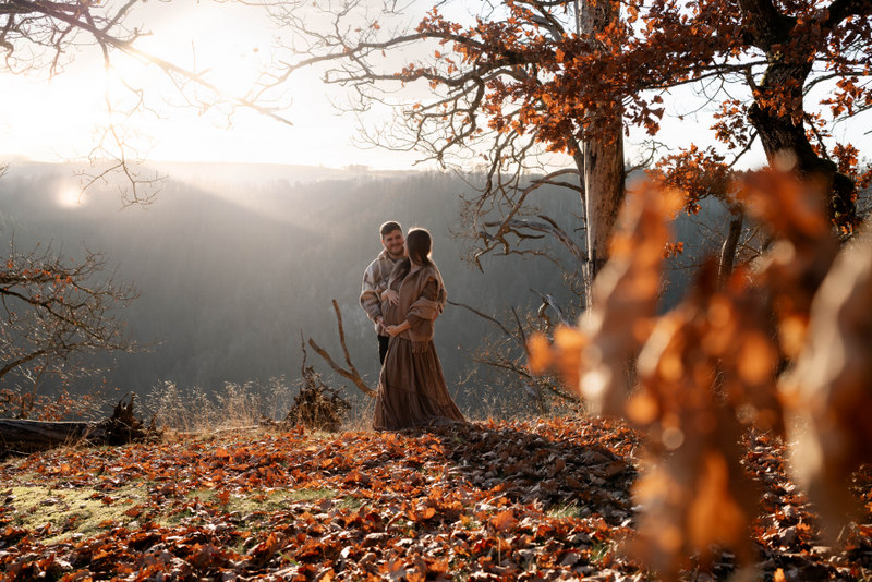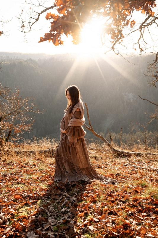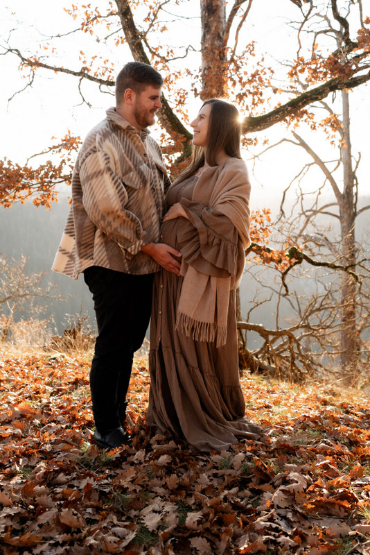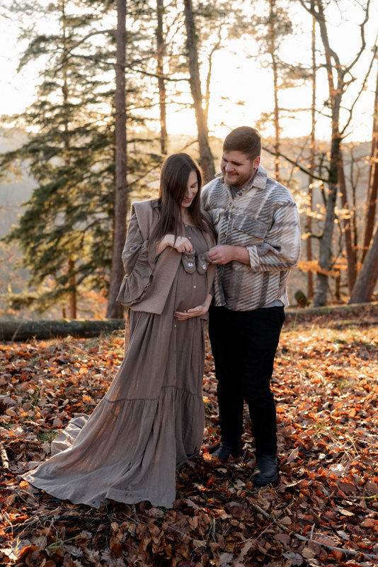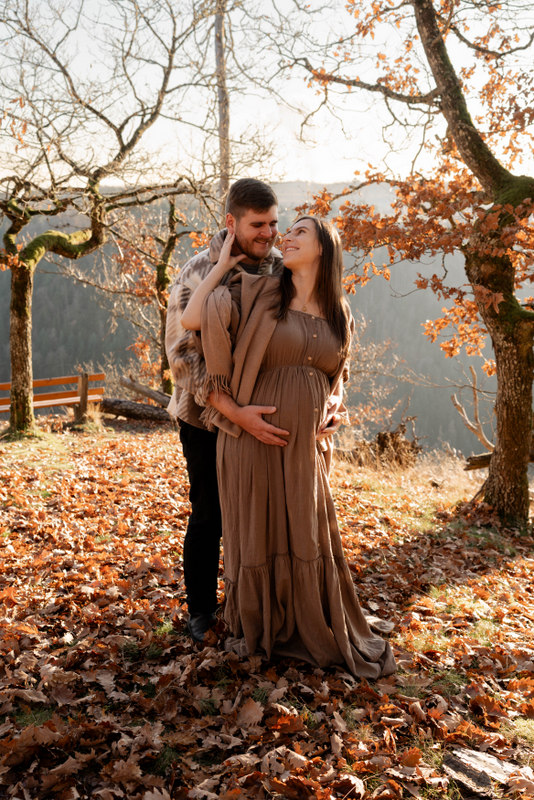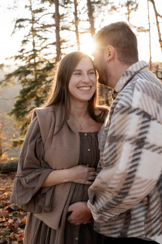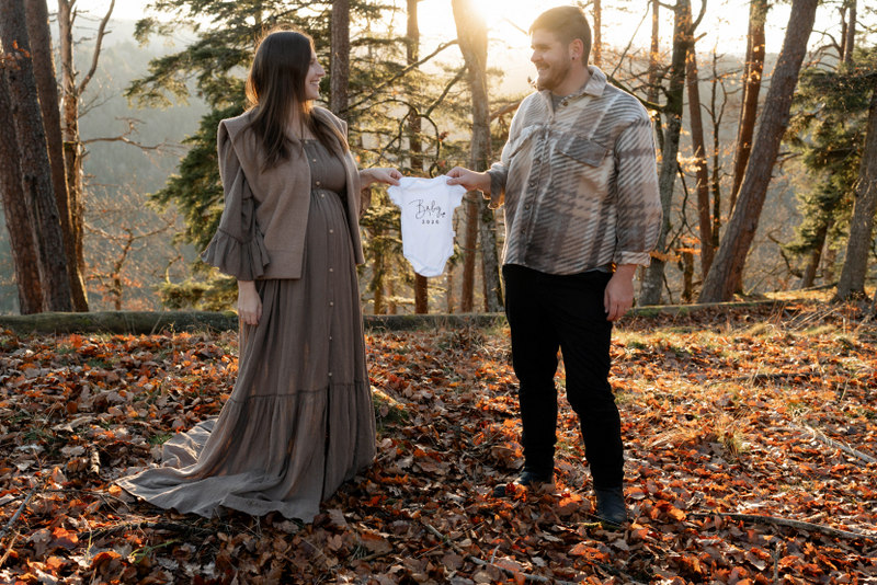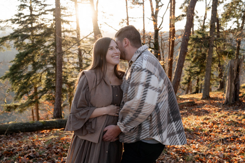Trotz der kühleren Jahreszeit wurden wir von einem warmen, goldenen Sonnenuntergangslicht begleitet, das die wunderschönen Herbstfarben im Wald zum Leuchten brachte. Genau diese besondere Lichtstimmung und die Ruhe des Spätherbstes machen Maternity Fotos zu dieser Jahreszeit so unglaublich stimmungsvoll. Unsere Region – vom Schwarzwald bis hin zur Nähe zur Schweiz – bietet dafür die perfekte Kulisse: sanfte Waldwege, warme Farbtöne und eine Natur, die Geschichten erzählt.