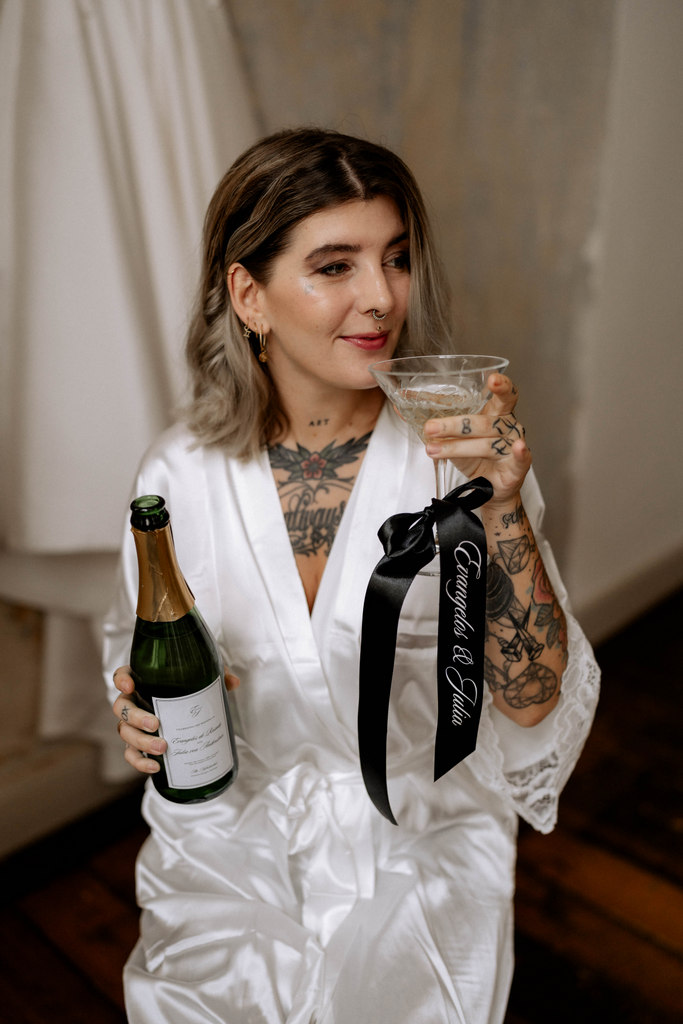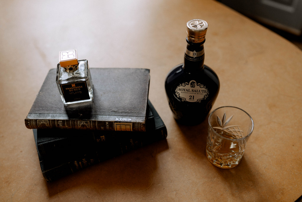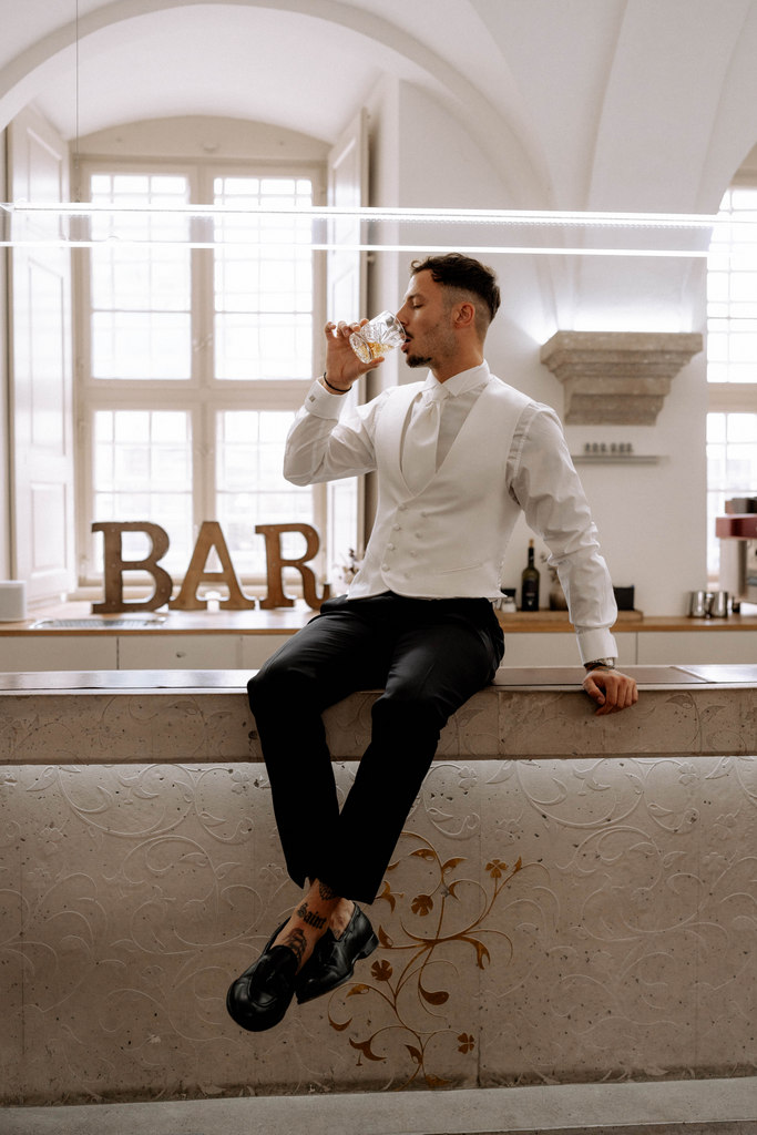 Der Bräutigam bereitete sich in der gemütlichen Bar der Location vor – eine elegante, maskuline Kulisse, die perfekt für authentische, moderne Hochzeitsfotos geeignet ist. Die Braut startete ihren Tag ebenfalls in der Hofbibliothek und stieß zur Feier des Tages mit einem Glas Sekt an – ein Moment voller Ruhe, Vorfreude und femininer Eleganz.