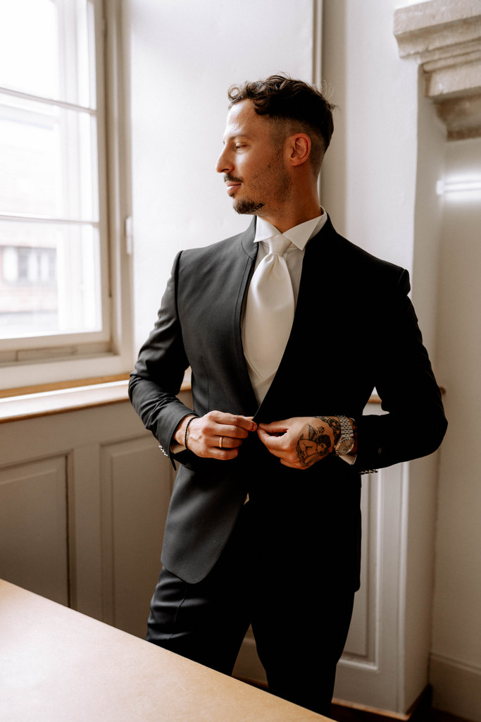 Das Style-Shoot begann mit zwei Getting-Ready-Momenten direkt in der Hofbibliothek: