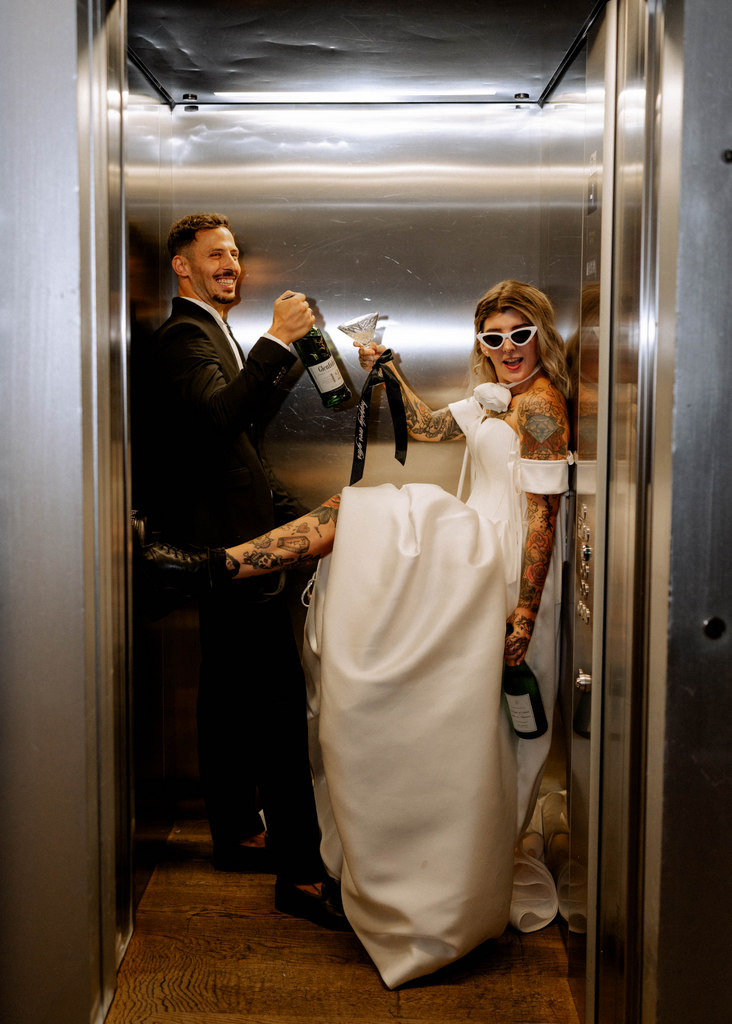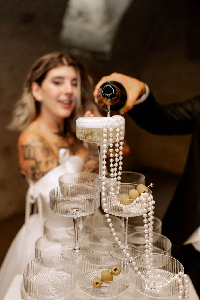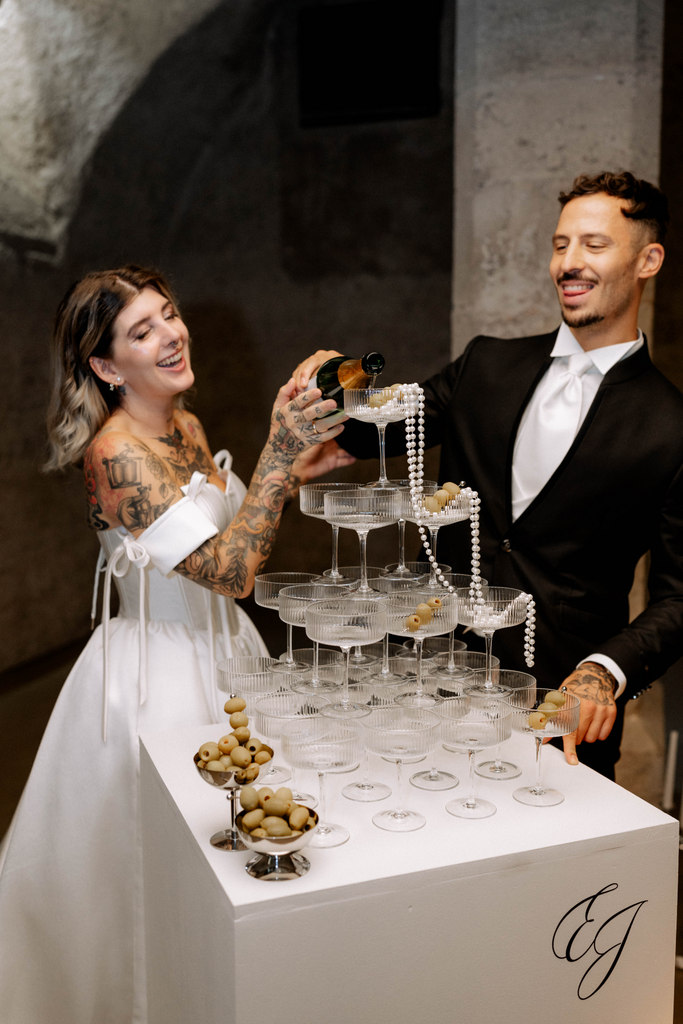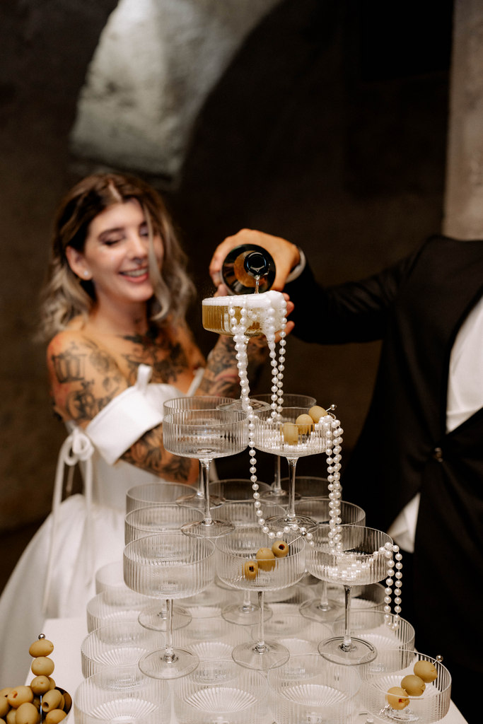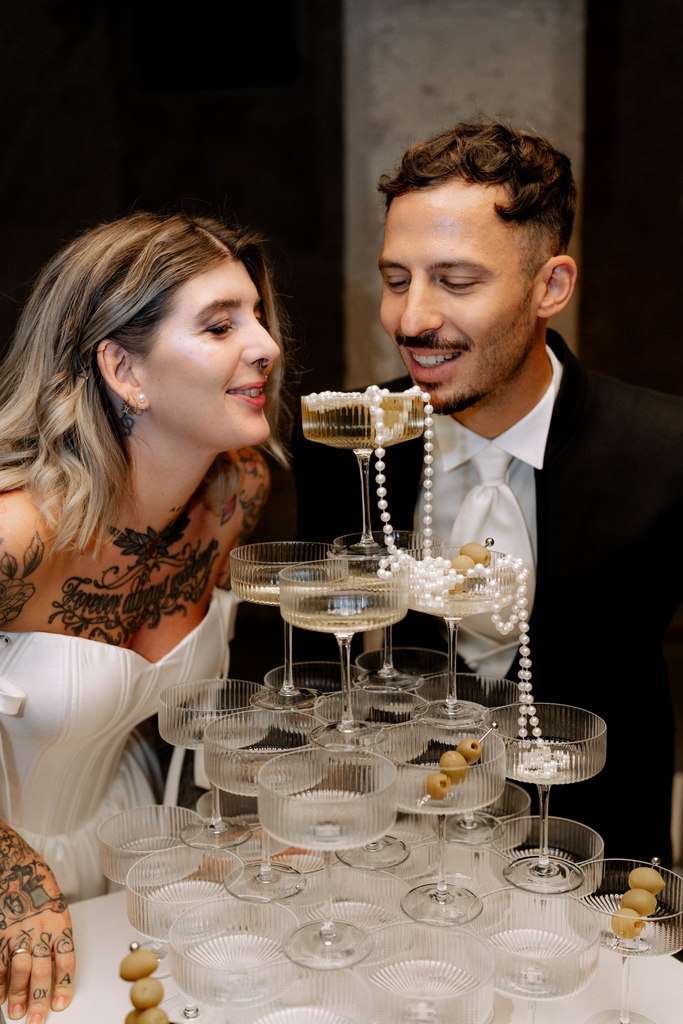 ein funkelnder Sekt-Turm, den das Paar gemeinsam befüllte,